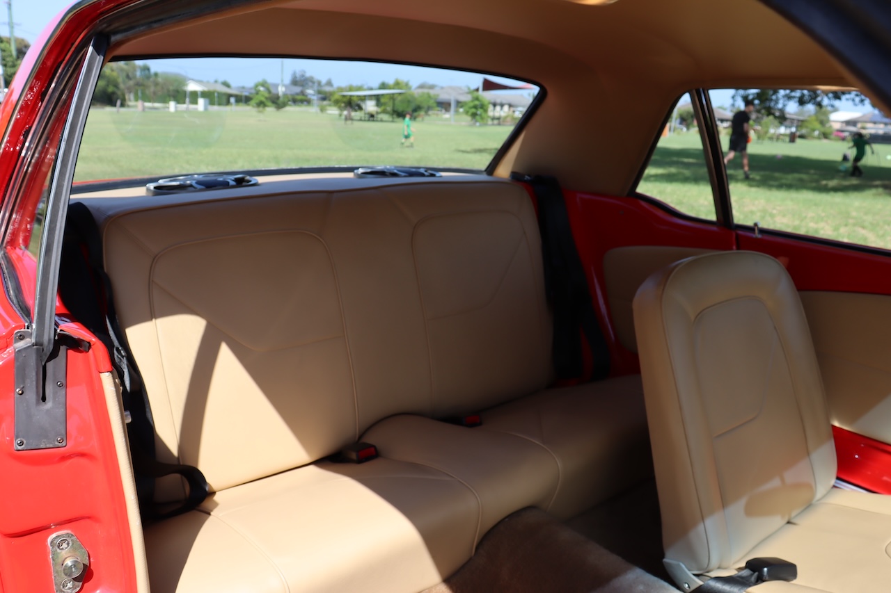 Updates include: Body work restored it to it’s current condition, new paint job in Bright Red, upgraded engine, larger brakes all round, new 18×7 front and 18×8 rear Showwheels Streeter Wheels, new chrome bumpers. Inside has new seats are tan leather, Autometer Procomp Gauges, modern Pioneer Stereo unit with front and back speakers, new Bluetooth radio, walnut wood steering wheel. Also, smoothened engine bay- its quite show worthy!